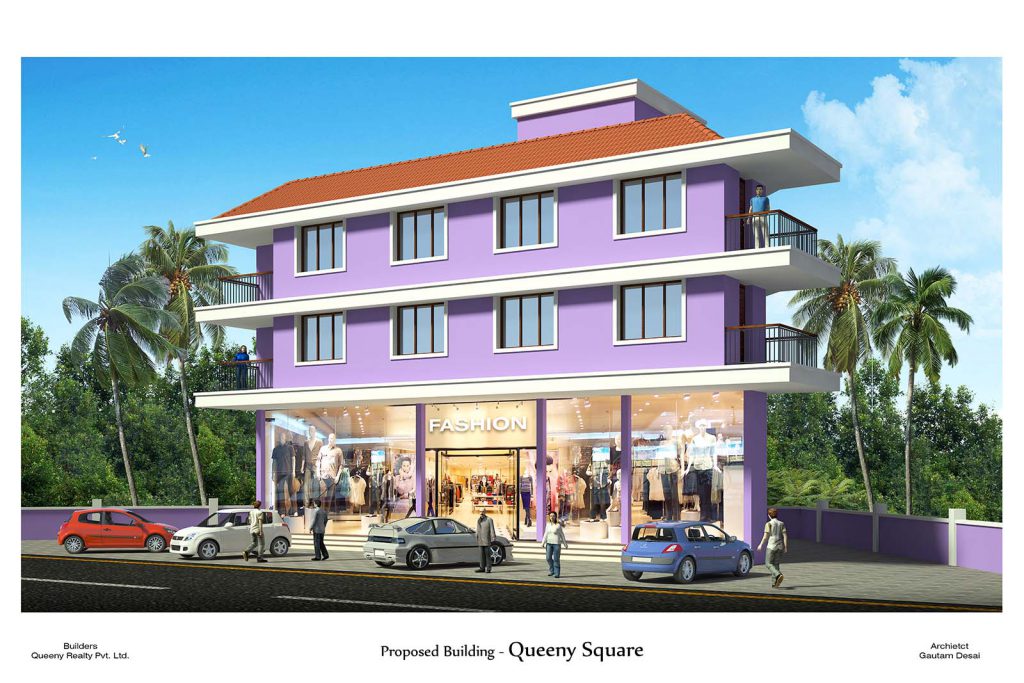 Queeny Square is a small project behind the Queeny House at Velsao-Pale consisting of a showroom of around 100 sq.mtrs with double height on the Ground Floor, and just an apartment of around 160 sq.mtrs each on the First and Second Floor, overlooking the National Highway 17-B.